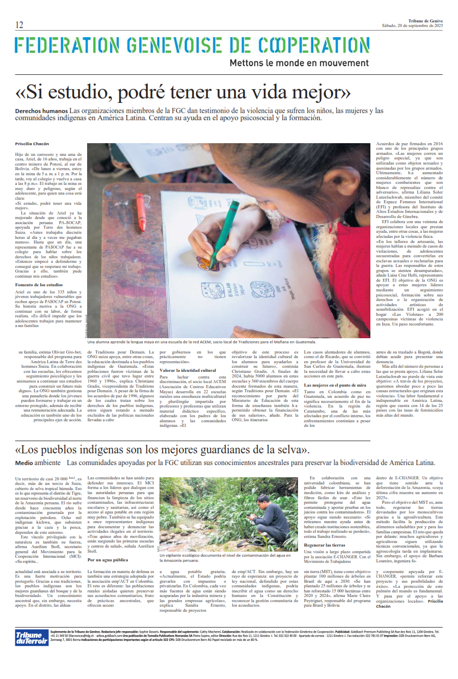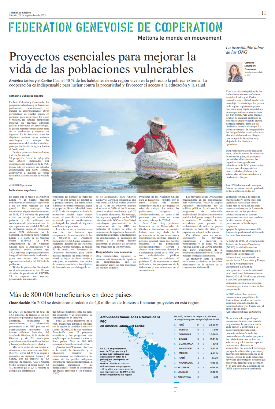 Desde 2021, el Departamento Federal de Asuntos Exteriores (DFAE) ha definido nuevas directrices geográficas en el ámbito de la cooperación internacional, reorientando su acción hacia África, Asia y Europa del Este, manteniendo únicamente la ayuda de emergencia en caso de desastres en el continente latinoamericano. Además, desde 2025, el DFAE ha solicitado a las ONG que trabajen en consonancia con esta estrategia. Sin embargo, la Federación considera necesario continuar sus actividades en América Latina y el Caribe con el apoyo de las autoridades públicas de Ginebra.