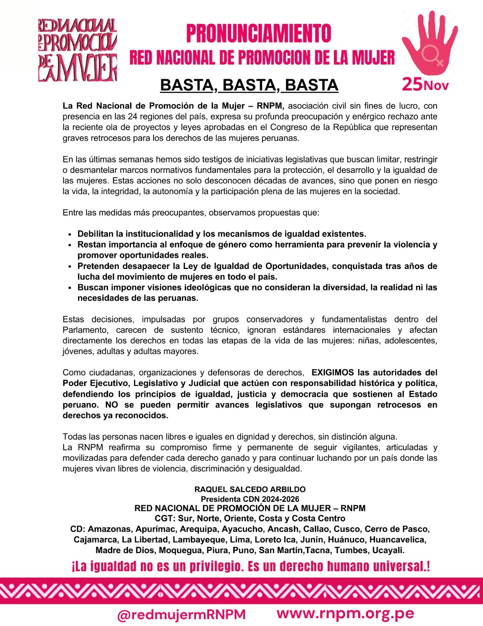 Frente a la reciente propuesta que pretende eliminar la Ley de Igualdad de Oportunidades, la Red Nacional de Promoción de la Mujer – RNPM expresa su rechazo absoluto a cualquier retroceso que vulnere los derechos de las mujeres en el Perú.